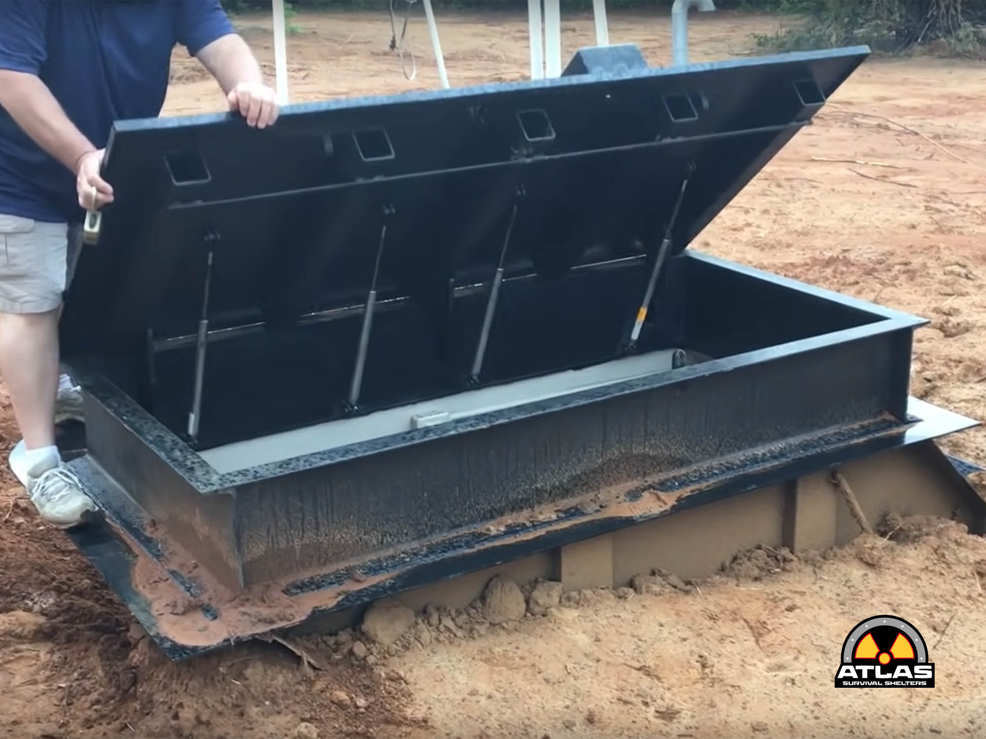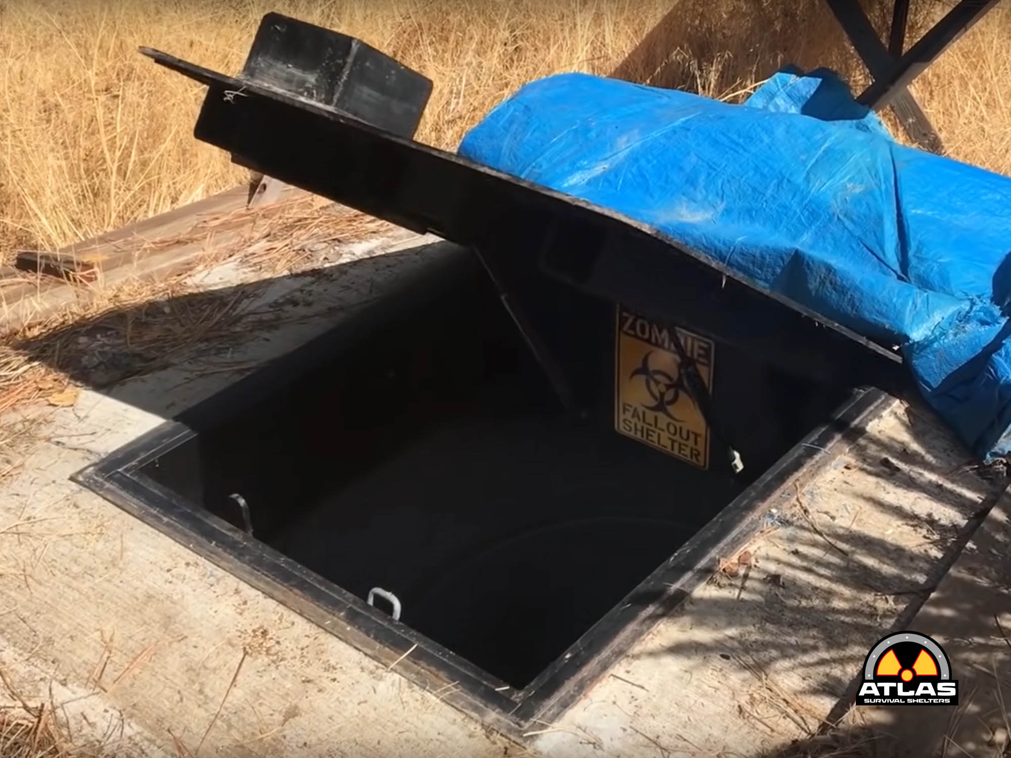 Our hatches are designed after the nuclear blast hatch by the US Nuclear Civil Defense Department. It is surrounded by heavy 12″ channel, then surrounded with 12″ of concrete.